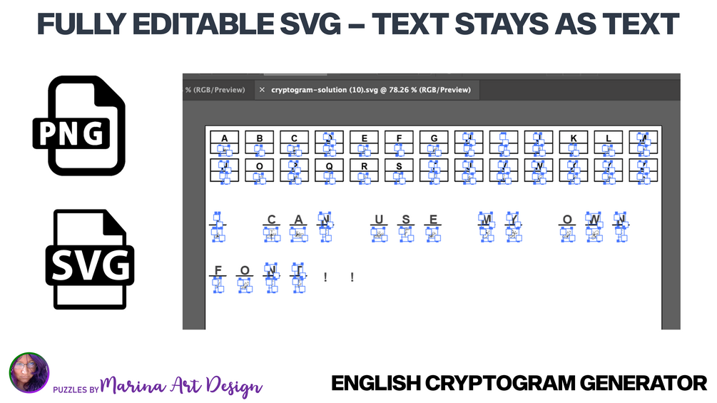 Please note that if the font doesn't have all the letters, they will not be visible in SVG file format, but the Cryptogram will export them in PNG.